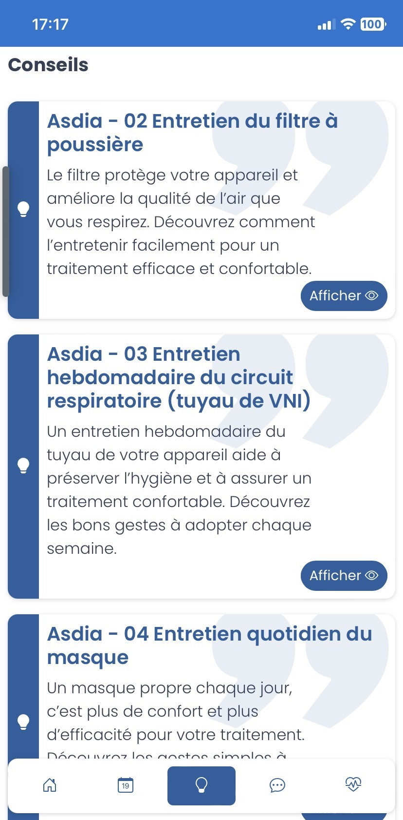 - Questionnaires avec score, consignes, conseils, coaching, RDV, données issues d’objets connectés